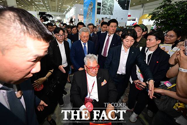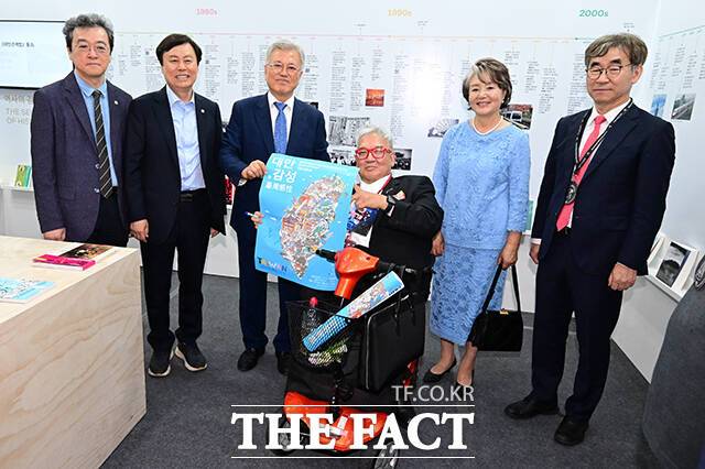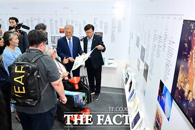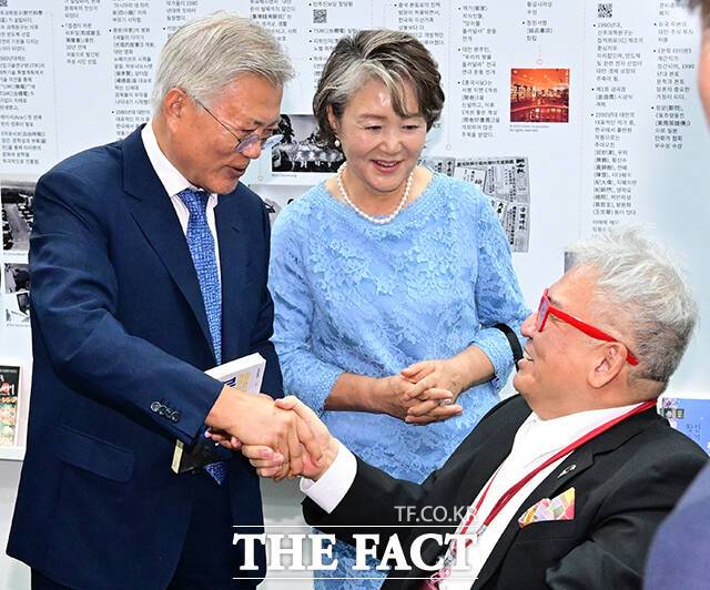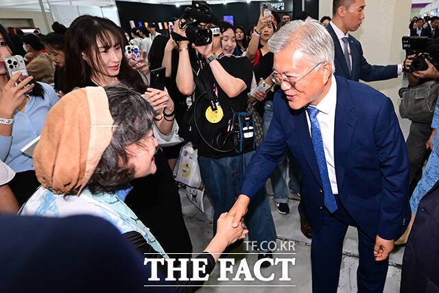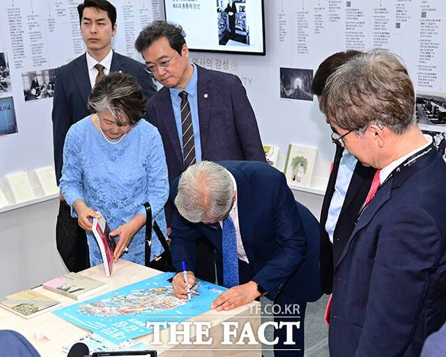 [더팩트ㅣ남윤호 기자] 문재인 전 대통령과 김정숙 여사가 18일 오후 서울 강남구 코엑스에서 열린 2025 서울국제도서전을 방문해 대만의 '찬란한 불편'의 저자 하오밍이에게 책을 선물받고 있다.