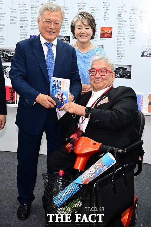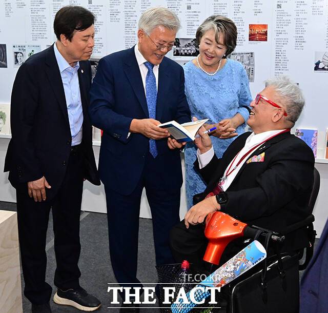 문재인 전 대통령과 김정숙 여사가 18일 오후 서울 강남구 코엑스에서 열린 2025 서울국제도서전을 방문해 대만의 '찬란한 불편'의 저자 하오밍이에게 책을 선물받고 있다.