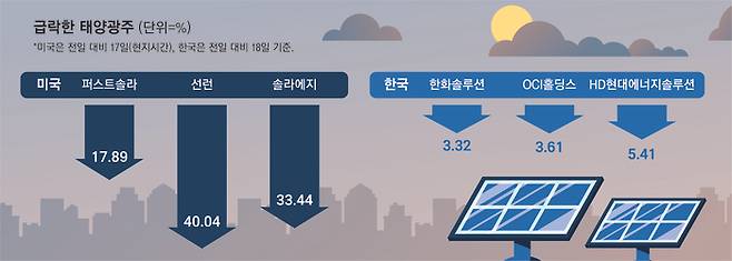 미국에서 태양광 모듈 공장을 운영하는 한화솔루션도 이날 3.32% 하락한 3만2050원에 거래를 마쳤다.