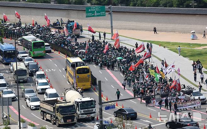 [서울=뉴시스] 김진아 기자 = 전국민주노동조합총연맹 조합원들이 18일 서울 중구 광화문 일대에서 사전집회를 마친 뒤 최저임금노동자 민주노총 공동파업대회에 참여하기 위해 서울고용노동청으로 행진하고 있다. 2025.06.18. bluesoda@newsis.com