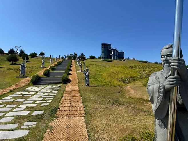 | ▲ 수로부인 헌화공원. 수로부인을 구하기 위해 모여든 사람들을 조각하여 언덕을 따라 배치했다. |