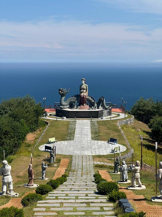 | ▲ 수로부인 헌화공원. 수로부인과 동해바다 용을 조각한 거대한 조각상. 높이 10.6m, 가로 15m, 세로 13m, 중량 500t에 달하는 거대한 대리석 조각상으로 웅장함과 신비로움에 감탄하게 된다. |