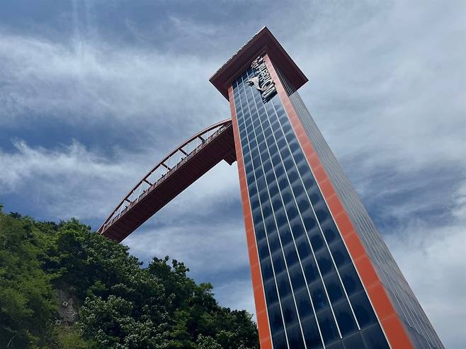 | ▲ 수로부인 헌화공원으로 올라가는 엘레베이터. 엘레베이터의 투명한 유리 너머로 동해바다가 크고 시원하게 보인다. |
