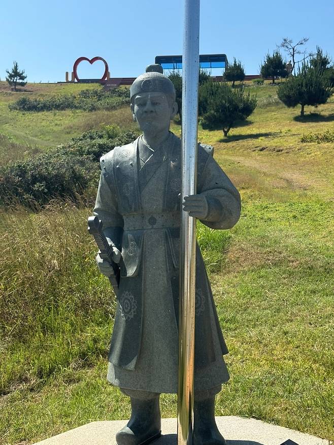 | ▲ 수로부인 헌화공원. 용에게 납치된 수로부인을 구하기 위해 온갖 마을 사람들이 하던 일을 멈추고 급히 모여 해가사를 부른다. 장군 동상. |