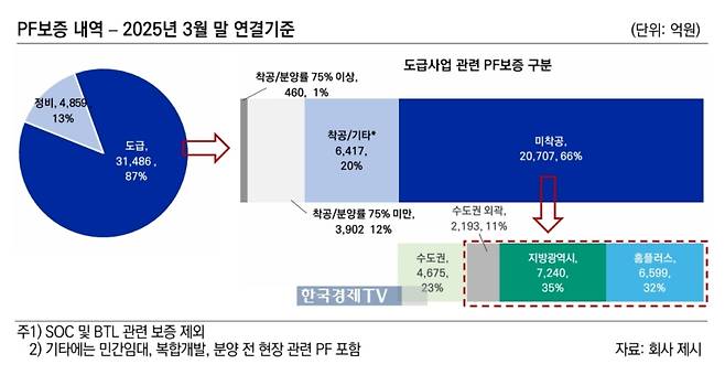 지난 3월말 기준 롯데건설의 도급사업 PF 우발채무는 3조1천억원 규모다. 이미 도급사업 PF 보증의 상당부분을 미착공 사업장이 차지하는 상황에서 대구·광주·김해 등 입지요건이 상대적으로 열위한 수도권 외곽과 지방지역 소재 사업장의 미분양이 지속되며 위험을 키우고 있다는 분석이다.