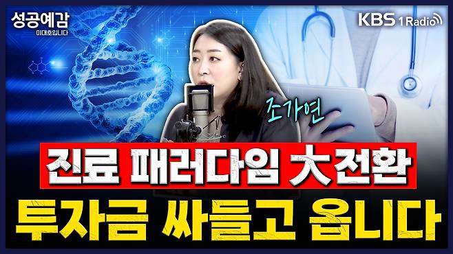 ◇김원장> 성공예감 이대호입니다. 2부 시작합니다. 저는 오늘 이대호 편집장이 개인 사정으로 대타 진행을 맡고 있는 기자 김원장입니다. 지금도 대부분의 병원에서 같은 병이라면 환자의 상태 특성보다는 동일한 약을 매뉴얼대로 치료해 줄 거 아니에요. 그러다 보면 사람마다 다 다르니까 반응이 제각각이겠죠. 누군가에게 효과는 있어도 누군가에게는 부작용이 날 수도 있는 거고요. 그런데 이제는 한 명 한 명 개인별 맞춤 치료로 의료 시장이 바뀌고 있다는 거 아니에요? 귀가 솔깃하시죠. 이때 반드시 알아야 하는 게 바로 유전자 그중에서도 유전체 정보라는 건데 조가연 벤처캐피탈리스트와 함께 최근 5년 사이에 빠르게 발전하고 있는 유전체 기술 알아보겠습니다. 어서 오세요.