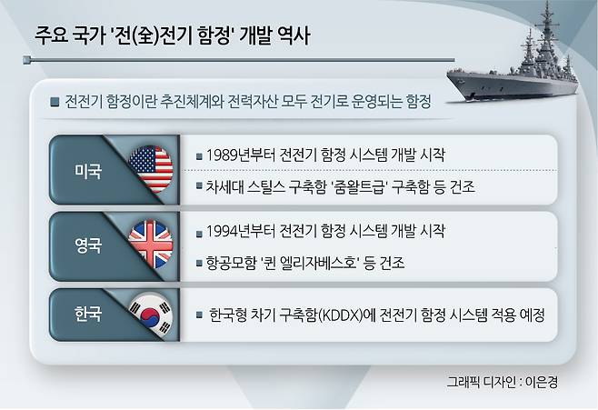 전전기 함정은 추진체계와 전력자산 모두 전기로 운영된다. 기존 디젤엔진 함정 대비 기동성이 높고 소음이 적어 작전 수행 능력이 우수하다. 뛰어난 장점 덕분에 주요 국가들은 일찌감치 전전기 함정 개발에 나섰다. 미국은 1989년부터 전전기 함정 기반인 전기 추진 시스템 개발을 시작했다. 1999년에는 필라델피아에 전용 시험소를 구축했다. 영국은 1994년부터 전기 추진 시스템 개발을 진행했다.