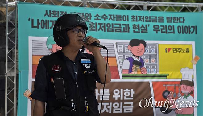 | ▲ 민주노총대전지역본부는 18일 대전 서구 둔산동 선사유적네거리(대전무역회관 앞)에서 최저임금 오픈마이크 캠페인을 펼쳤다. 사진은 발언을 하고 있는 송석호 라이더유니온 대전지회장. |