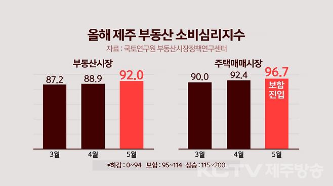 특히 주택매매시장 소비심리지수는 96.7을 기록하며 올해 처음 하강에서 보합 국면으로 진입했습니다.