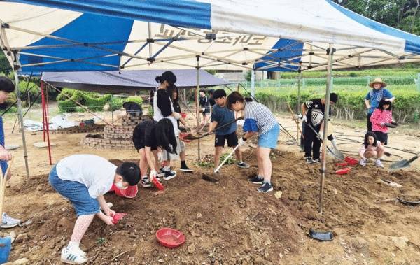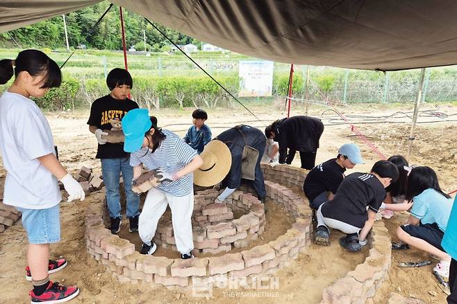 | ▲ 학생들이 협동하면서 직접 벽돌을 옮기고 쌓으며 나선형 정원 뼈대를 잡고 있다. |