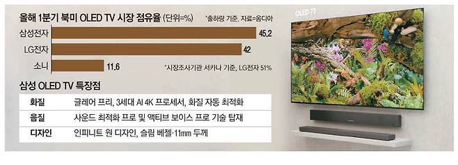 시장조사기관 옴디아에 따르면 삼성전자는 지난 1분기 북미 OLED TV 시장에서 점유율 45.2%(출하량 기준)로 1위를 차지했다.