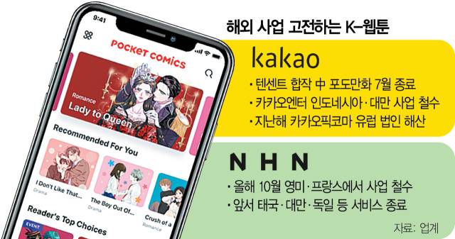 NHN(181710)도 올해 10월 영미권과 프랑스에서 운영 중인 웹툰 서비스 ‘포켓코믹스’를 종료하기로 결정했다. 전 세계 웹툰 시장 성장세에 힘입어 NHN은 대만, 태국, 베트남, 독일 등에서 서비스를 전개했으나 지난해를 기점으로 사업을 모두 정리했다. NHN은 한국에서 운영 중인 웹툰 플랫폼 ‘코미코’도 올해 10월까지만 운영하고 가장 큰 만화 시장인 일본 사업에 집중한다는 방침이다.