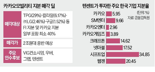 18일 투자은행(IB)업계에 따르면 텐센트는 카카오모빌리티 지분 매각을 추진 중인 재무적 투자자(FI)들에 인수 의사를 내비친 뒤 물밑 논의를 진행하고 있다. 매각 대상은 TPG·칼라일 등이 보유한 지분 약 40%다. 인수가 성사되면 텐센트는 카카오에 이어 카카오모빌리티 2대주주가 된다. 이 지분을 사들이기 위해 VIG컨소시엄(VIG파트너스 무바달라 골드만삭스)이 협상하는 가운데 텐센트도 인수 의사를 밝힌 것이다.
