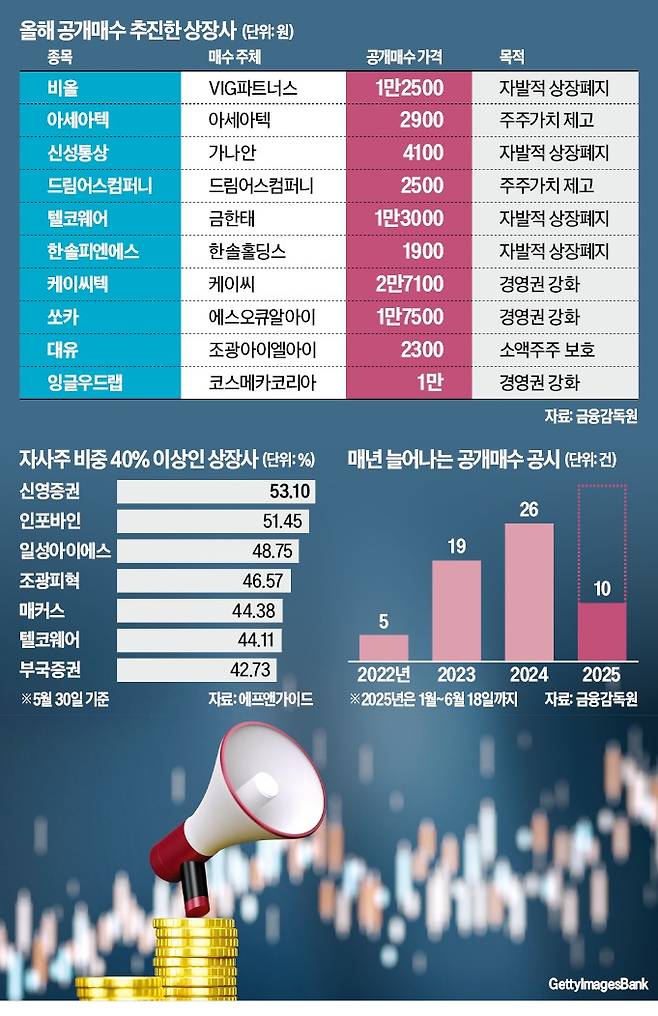 이재명 정부의 상법 개정 및 자사주 소각 의무화 조치 등을 앞두고 웃돈을 얹어 주식을 되사는 공개매수 사례가 잇따르고 있다. 거세지는 주주환원 요구에 부담을 느낀 상장사들이 유통주식 공개매수 후 자발적 상장폐지에 나서고 있다는 분석이 나온다. 자사주 비중이 높지만 최대주주 지분율이 낮아 경영권 위협이 가시화할 수 있는 상장사의 자진 상장폐지 시도가 늘어날 것이란 게 증권가의 시각이다.