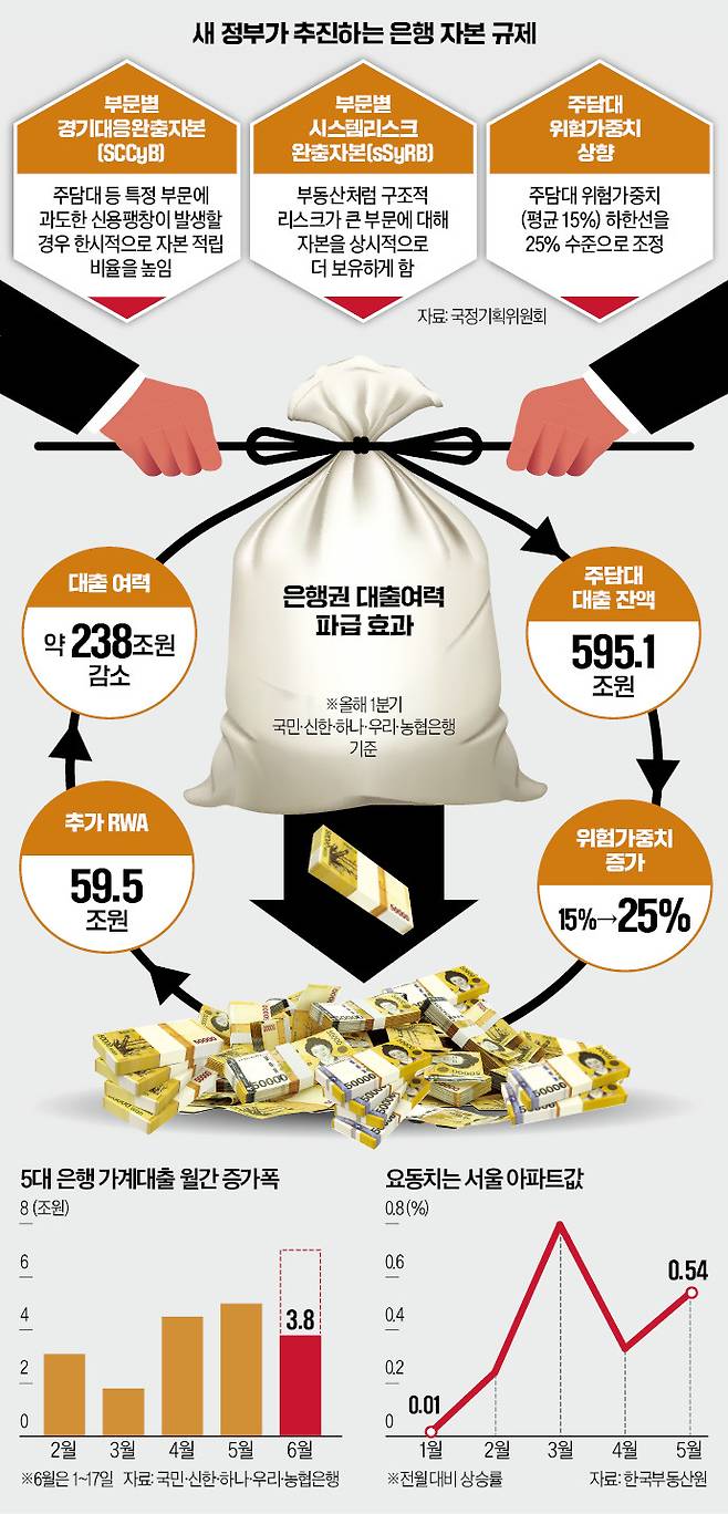 18일 국정기획위에 따르면 가계대출과 부동산 시장 안정 방안으로 유력하게 검토되는 것은 크게 두 가지다. 첫 번째는 부문별 경기대응완충자본(SCCyB), 부문별 시스템리스크완충자본(sSyRB) 등 부동산 시장 관련 완충자본을 은행에 추가로 쌓도록 하는 것이다. SCCyB는 주담대가 급증할 때 한시적으로, sSyRB는 부동산을 금융시스템의 리스크로 보고 상시로 자본을 더 보유하게 하는 제도다.