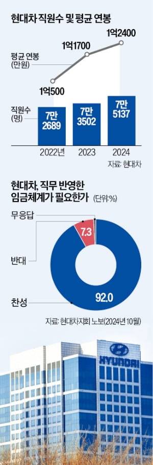 현대차가 직무수당 개편을 논의하기로 한 건 현장 근로자들의 요구가 많아서다. 지난해 10월 현대차 노조가 조합원을 대상으로 한 설문조사에서 ‘직무의 특수성이나 직무 가치를 반영한 수당 등이 포함된 임금체계 개편이 필요하다고 생각하냐’는 질문에 기술·정비·영업직 조합원의 92.0%가 찬성한다고 답했다. 연공 서열이 같더라도 하는 일이 다르면 수당을 달리해야 한다는 의미다. 생산직은 차량 생산량에 따른 특근 수당 등을 받고 있어 추가 수당을 도입하는 데 상대적으로 거부감이 작다.