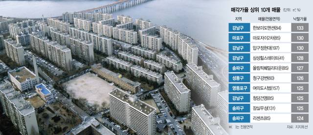 성동구 성수동 청구강변 전용 60㎡는 감정가 18억 2900만 원에 23억 1550만 원으로 낙찰돼 126%의 매각가율을 기록했다. 영등포구 여의도동의 주요 재건축 단지로 꼽히는 시범 157㎡는 감정가 32억 4000만 원, 낙찰가 40억 8000만 원으로 매각가율이 125%다.