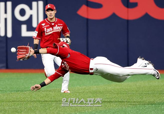 1회말 1사 1,2루 최주환의 안타성 타구를 우익수 최준우가 다이빙캐치로 잡아내고 있다.