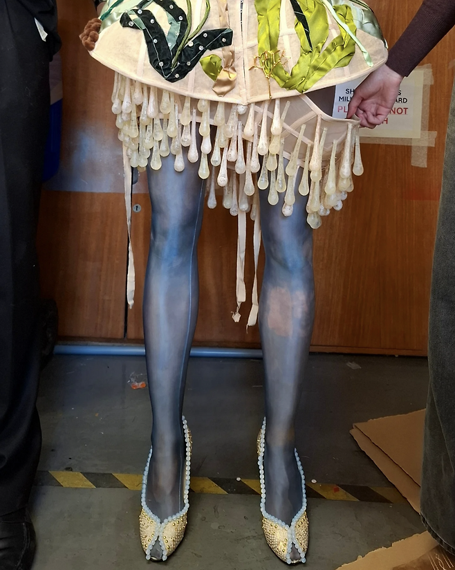 2025 세인트 마틴 졸업 쇼의 1등을 거머쥔 주인공부터 살펴보죠. 마야 의 컬렉션은 1950년대 텍사스에 UFO가 추락했다는 이야기에서 출발합니다. 주제가 흥미로운 만큼 매우 독창적인 작품이 탄생했죠. 구미호를 떠오르게 하는 라텍스 꼬리, 부풀어 오른 형태로 신체를 감싸는 크로셰 니트까지. 독특한 형태와 소재로 이야기 속 마을 사람들을 유쾌하게 그려냈습니다. 자칫 과해 보일 수 있는 옷도 마야의 손을 거치면 익살스러운 매력이 살아나죠. 그의 옷을 입은 아티스트들의 모습이 벌써 기대되지 않나요?