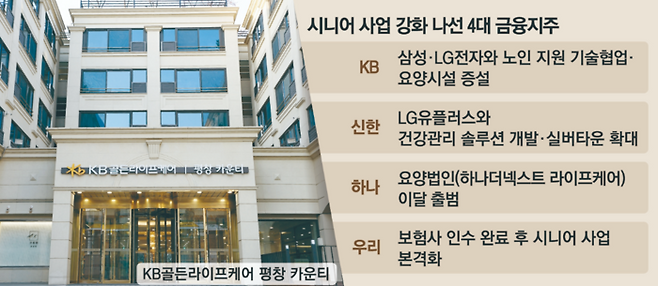 18일 금융권에 따르면 KB금융은 삼성·LG전자와 손잡고 고령층을 위한 첨단 정보기술(IT) 개척에 나섰다. KB금융에서 노인 요양사업을 하는 KB골든라이프케어는 최근 삼성·LG와 시니어 테크 실증 사업을 시작했다. 초고령화 시대 경쟁사와 기술 격차를 벌려 요양 사업 1위 자리를 굳히겠다는 전략이다.