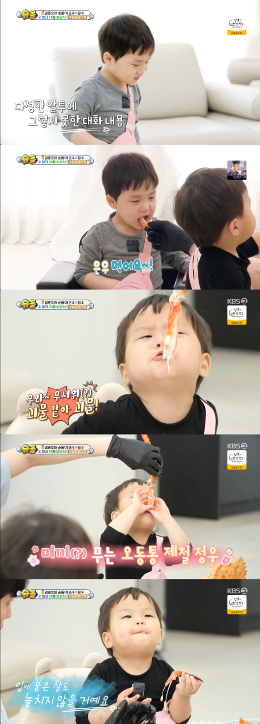 '슈퍼맨이 돌아왔다' 김준호의 아들 은우, 정우가 킹크랩을 맛있게 먹었다.