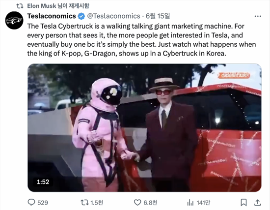 최근 일론 머스크는 자신의 X 계정을 통해 지드래곤의 사이버트럭 탑승 영상을 리트윗했다.