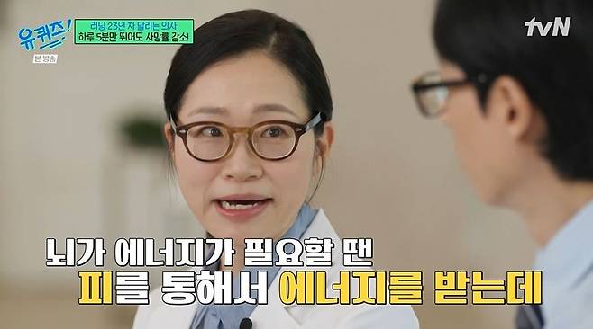 뇌도 달려야 좋아진다고. 정세희는 "뇌가 에너지가 필요할 땐 피를 통해 에너지를 받는다"라며 혈관이 건강해야 한다고 밝혔다. 뇌에 쌓인 노폐물을 빨리 제거하는데도 유산소 운동이 필수라고. 유재석이 "하루에 얼마나 달려야 좋냐"라고 묻자 정세희는 "숨이 차는 중강도 유산소 운동을 일주일에 2시간 반 하란 거다. 하루에 30분씩 5번 하면 된다"라고 밝혔다. 유재석은 "쉽지 않다. 걷는 거 안 되냐"라고 하기도. 정세희는 "지난주엔 110km 뛰었고, 오늘도 14km 뛰었다"라고 밝혔다.