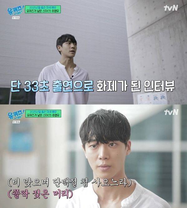 33초의 길거리 인터뷰가 아니라 정식으로 '유퀴즈'에 초대된 추영우. 6년 전 한예종 1학년에 재학 중이던 당시 상황에 대해 "수업 중에 배가 고파서 단백질 칩을 사려고 매점에 가던 중인데 비가 많이 오더라. 우산도 없는데 뛰어갔다 와야겠다 싶었다. 열심히 뛰어서 사서 돌아오는데 저 멀리 카메라 한 대와 스태프 분들이 계시더라. '학생 잠깐 시간되면 학교에 대해 질문하려고 한다'고 하셔서 열심히 답변했다"