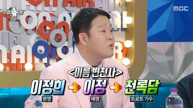 이를 들은 김구라는 "원래 본명이 이정희였는데, 이정에서 천록담으로 바꾸었다. 활동 비율이 어떻게 되냐"라고 물었고, 이정은 "천록담이 100%다"라고 단호하게 말했다. 김구라가 "이정 시절 '다신' 섭외 들어오냐"라고 하자 이정은 "안 오고 있다"라고 밝혔다. 유세윤은 "천록담으로 이정 노래 부르지 않냐"라고 물었고, 이정은 "그런 경우는 거의 없다"라고 했다.