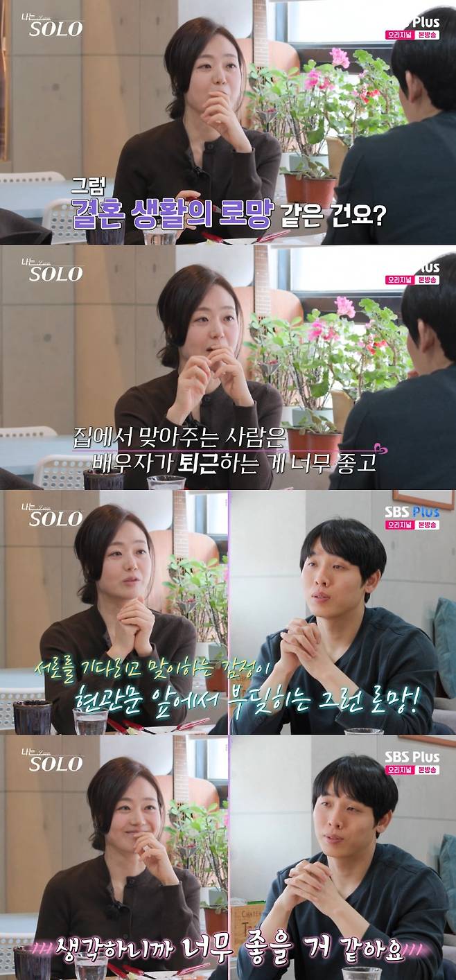 첫 번째 로망으로는 "먼저 퇴근하는 사람과 늦게 퇴근하는 사람이 있을 거 아니냐. 집에서 맞아주는 사람은 이 사람이 퇴근하는 게 너무 좋고 신나고, 들어오는 사람은 너무 안도가 된다"면서 "그런 감정이 현관문 앞에서 부딪히는 그런 로망"이라고 밝혔다.
