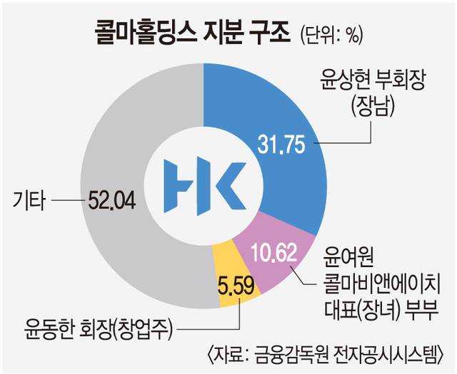 윤 회장은 아들 윤 부회장에게 콜마홀딩스·한국콜마를, 딸 윤여원 대표에게는 콜마비앤에이치의 경영을 각각 맡겼다. 콜마비앤에이치의 운영과 콜마홀딩스의 지원에 대한 구체적인 내용은 ‘3자 간 합의서’에 담긴 것으로 전해진다. 이후 윤 회장은 윤 부회장에게 콜마홀딩스 지분을 증여했고, 최대주주가 된 윤 부회장은 지난해 5월 콜마홀딩스 대표이사직에 올라 그룹을 이끌고 있다. 부녀 측 지분을 모두 합해도 윤 부회장이 보유한 지분 31.75%에 크게 못 미친다.