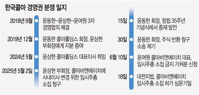 남매 갈등은 윤 부회장이 지난 4월 콜마비앤에이치 사내이사 선임을 위한 주주제안을 제기하고, 지난달 2일 대전지방법원에 임시주총 소집 허가를 신청하면서 본격화했다. 콜마비앤에이치의 실적 부진과 주가 하락 문제를 개선하기 위해 본인을 사내이사로 선임하라는 요구가 주된 내용이었다. 윤 대표도 지난 10일 임시주총 소집 금지 가처분 신청을 제기하며 맞섰다. 윤 회장이 수차례 중재에 나섰으나 봉합에는 실패했다.
