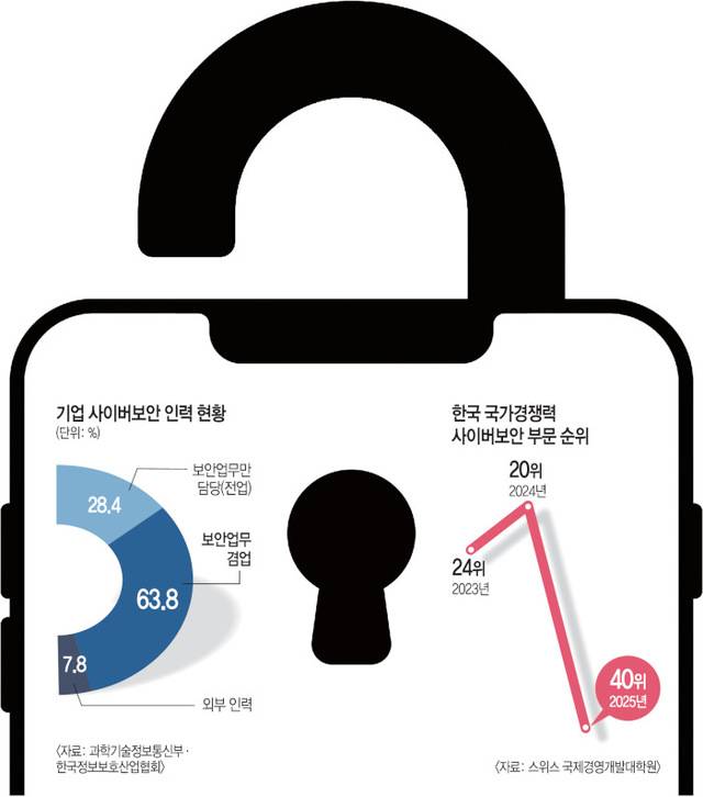 기업 내 사이버보안 전담인력이 부족한 것도 보안 역량 저하의 한 원인이다. 지난 4월 과학기술정보통신부가 발표한 ‘2024 사이버보안 인력수급 실태조사’를 보면 국내 기업의 사이버보안 인력 중 보안 업무를 전담하는 이는 10명 중 3명이 채 안 됐다. 보안 업무를 전업으로 담당하는 인력이 있는 기업은 28.4%에 불과했고, 다른 업무까지 겸업하는 인력이 63.8%, 외부 인력을 사용하는 경우가 7.8%였다. 보안 관련 고위험 산업인 정보통신업 내에서도 보안 업무만 담당하는 인력이 있는 경우는 53%에 그쳤다.
