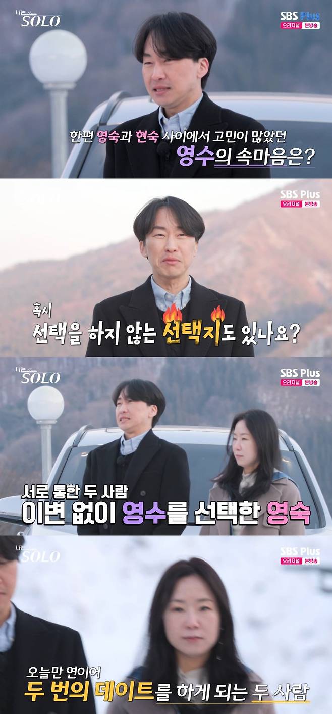 앞서 영숙과 현숙 사이에서 고민이 많았던 영수는 인터뷰에서 "이게 혹시 선택을 하지 않는 선택지도 있냐"면서 혼란스러운 마음을 토로했던 바.