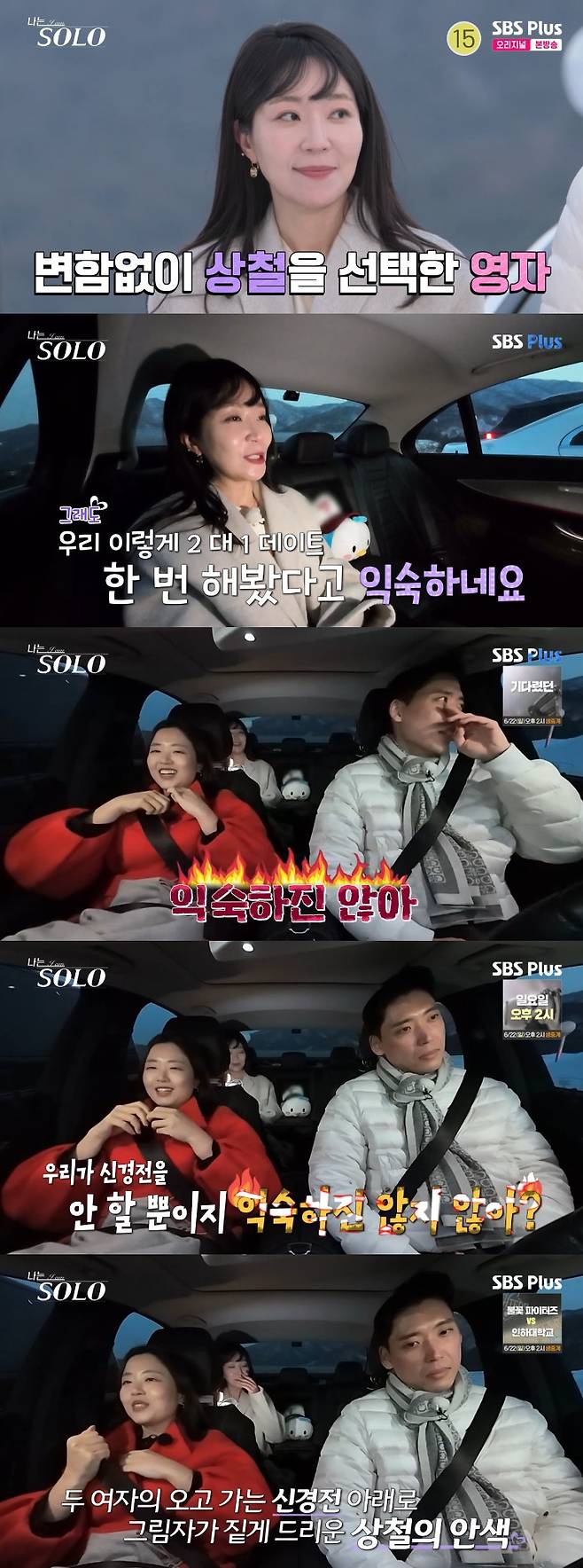 경수, 영식, 영철이 아무런 선택을 받지 못한 가운데, 유일하게 다대일 데이트를 하게 된 상철의 차 안에서 영자는 "2대1데이트해 봤다고 익숙하다"면서 이전에도 세 사람이 함께했던 기억을 떠올렸다.