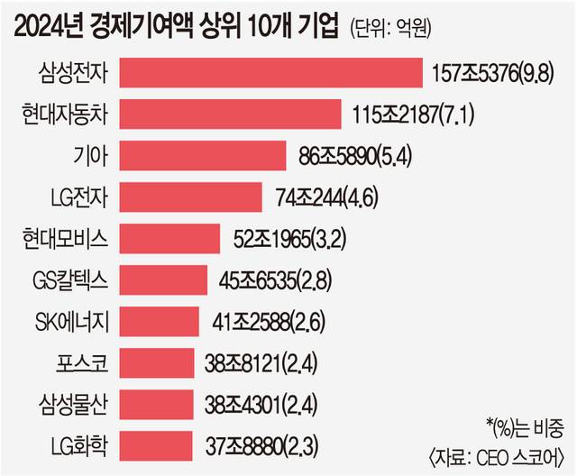 지난해 국내 100대 기업의 ‘경제 기여액’이 1600조원을 넘어선 것으로 나타났다. 경제 기여액 1위는 삼성전자로, 해당 조사가 시작된 2021년 이후 부동의 1위 자리를 지키고 있다. 전년 대비 기여액이 가장 많이 증가한 기업은 지난해 사상 최대 실적을 낸 기아였다.