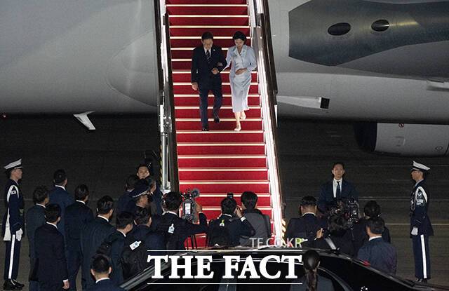 [더팩트ㅣ서울공항=박헌우 기자] 주요 7개국(G7) 정상회의 일정을 마친 이재명 대통령 부부가 19일 오전 경기 성남시 서울공항에 도착해 공군 1호기에서 내리고 있다.