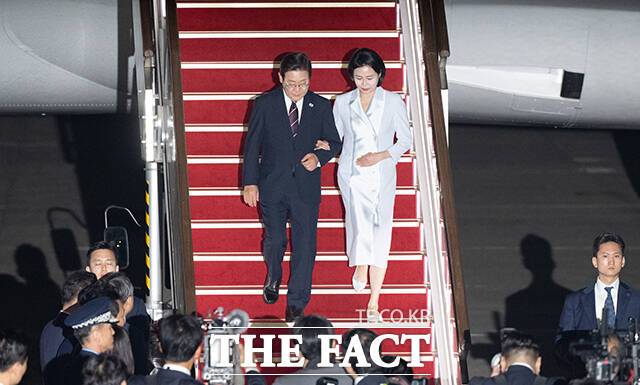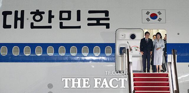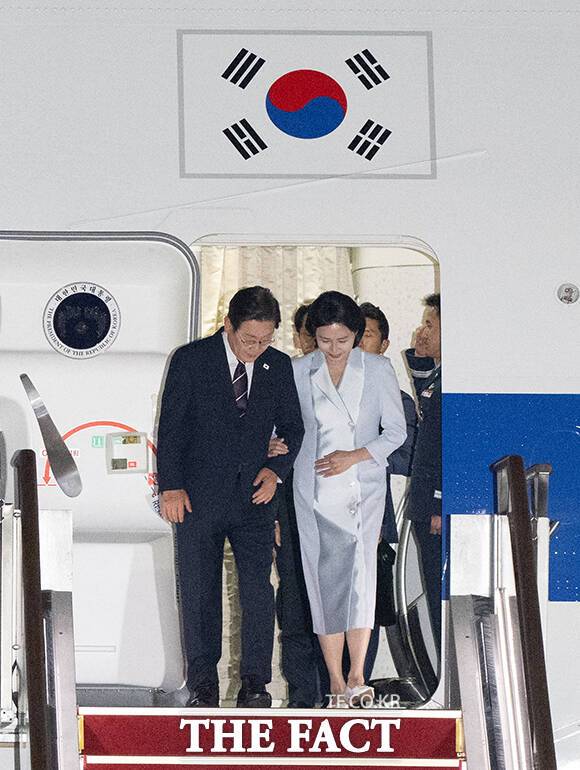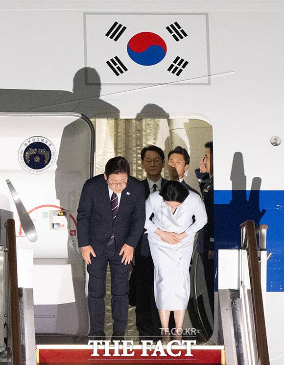 [더팩트ㅣ서울공항=박헌우 기자] 주요 7개국(G7) 정상회의 일정을 마친 이재명 대통령 부부가 19일 오전 경기 성남시 서울공항에 도착해 공군 1호기에서 내리고 있다.