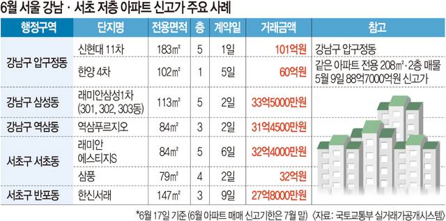 강남구 압구정동 신현대 11차 전용 183㎡ 5층은 지난 1일 101억원에 손바뀜하며 신고가를 기록했다. 압구정동 한양 4차는 지난 5일 전용 102㎡ 1층이 신고가인 60억원에 거래됐다. 지난 2월 27일 7층 매물이 50억원에 팔렸는데 3개월 만에 저층에서 10억원이 뛰었다. 서초구에서는 서초동 래미안에스티지S 전용 84㎡ 5층과 삼풍 79㎡ 4층, 반포동 한신서래 147㎡ 3층이 모두 신고가를 썼다.