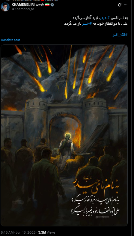 하이바르는 7세기 무슬림 군대가 정복했던 유대인 거주 지역이며, 하이다르는 이슬람 시아파 초대 이맘(지도자)인 알리를 뜻한다. 이스라엘에 대한 항전 의지를 강조한 메시지란 평가가 나온다. 하메네이는 이 게시물에 검을 뽑아 든 남성이 불타는 성 안으로 걸어 들어가는 이미지도 올렸다. 그는 이날 오후 TV 성명을 통해선 “이스라엘은 엄청난 실수를 저질렀으며 그 대가를 치르게 될 것”이라고도 밝혔다.