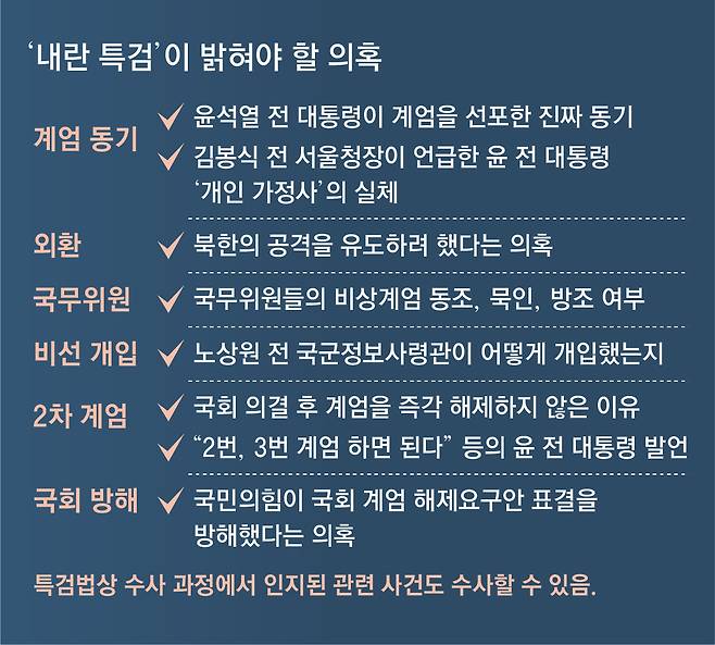 윤 전 대통령이 계엄을 선포한 진짜 이유가 아직 규명되지 않았다는 지적도 계속 제기되고 있어 특검이 수사를 집중할 것으로 보인다. 윤 전 대통령은 ‘릴레이 탄핵’ 등 야당의 국정 운영 방해와 부정선거 의혹 등을 계엄 선포 이유라고 주장했지만, 김봉식 전 서울경찰청장은 검찰 조사와 윤 전 대통령 탄핵 심판에서 ‘개인적인 가정사’를 언급하기도 했다. 지난해 12월 3일 오후 7시경 조지호 경찰청장과 함께 삼청동 안가에서 윤 전 대통령을 만나 계엄 관련 지시를 들을 때, 윤 전 대통령이 가정사를 계엄 선포 이유 중 하나로 얘기했다는 게 김 전 청장의 주장이다.