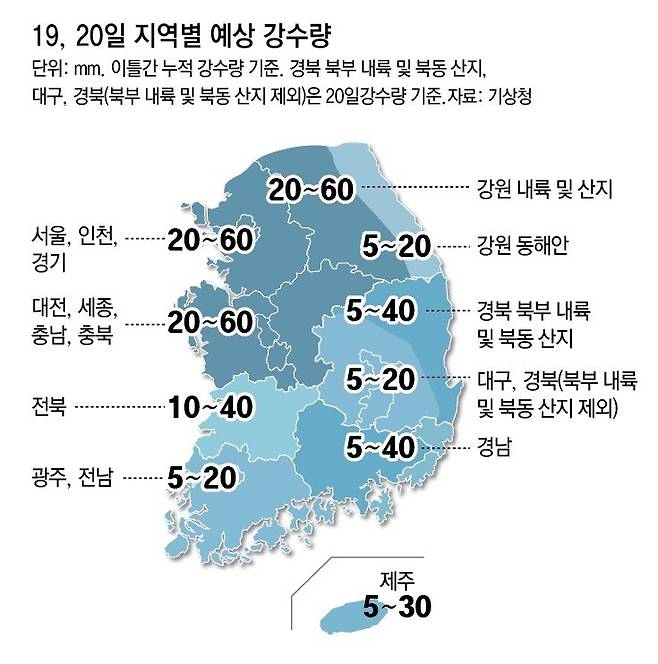 19일에서 20일까지 예상 강수량은 △서울, 인천, 경기, 강원 내륙 및 산지, 대전, 세종, 충남북 20∼60mm(경기 북부, 강원 북부 내륙 80mm 이상) △강원 동해안, 광주·전남 5∼20mm △경남, 경북 북부 내륙 및 북동 산지 5∼40mm 등이다.