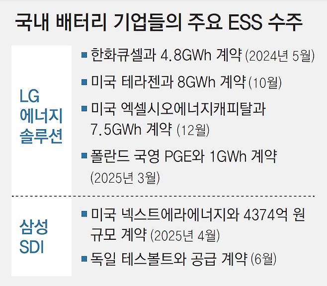 삼성SDI와 SK온도 ESS 시장에서 새 먹거리를 확보하기 위해 발빠르게 움직이고 있다. 삼성SDI는 현재 연 생산 능력의 90%에 달하는 수주를 확보했다. 올해 미국 넥스트에라에너지, 독일 테스볼트와 ESS 공급 계약을 체결했다. SK온은 지난해 말 조직 개편을 단행해 ESS사업실을 대표이사 직속으로 편재했다. 이석희 SK온 사장은 3월 주주총회에서 “연내 ESS 사업 성과를 내겠다”고 했다.