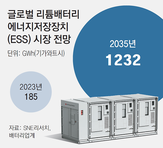 같은 맥락에서 ESS가 태양광, 풍력 등 재생에너지의 핵심 보완재로 각광받고 있다. 비가 내리거나 바람이 불지 않는 날씨 변동에 대응할 수 있다. 시장조사업체 SNE리서치에 따르면 글로벌 리튬 배터리 기반의 ESS 시장 규모는 2023년 185GWh(기가와트시)에서 2035년 1232GWh로 6.7배가 될 전망이다.