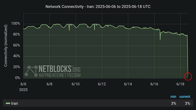 넷블록스가 공개한 도표를 보면 이란의 인터넷 접속도는 이달 초 80∼100% 사이를 오르내리다가 지난 13일 이스라엘의 대규모 이란 공습 이후로 차츰 하락해 이날 한 자릿수로 낮아졌습니다.