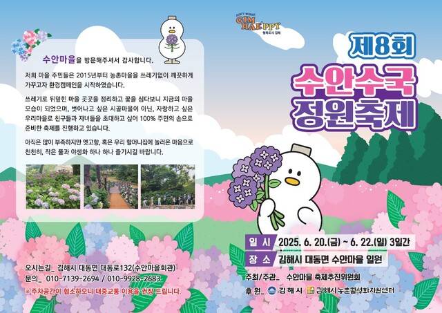 경남 김해시 대동면 수안마을에서는 오는 6월 20일부터 22일까지 ‘제8회 수안수국정원축제’가 열린다. 이 축제는 마을 주민들이 기획부터 운영까지 직접 참여해 일궈낸 대표적인 주민 주도형 축제로, 깨끗한 마을 만들기를 위한 쓰레기 줍기 활동에서 시작된 변화가 수국정원으로, 나아가 마을 축제로 결실을 맺게 된 사례다.
