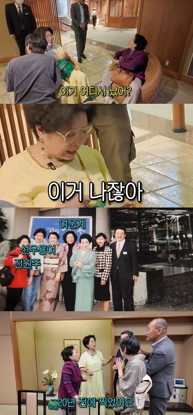 해당 사진에는 과거 똑같은 장소를 방문했던 두 사람과 고 여운계의 모습이 담겨 있었다. 20년 전에 사진을 찍었다는 말에 전원주는 "진짜?"라며 놀라워했고, 선우용여는 "내가 예순 살 때 왔구나"라며 깨달은 듯한 모습을 보였다.
