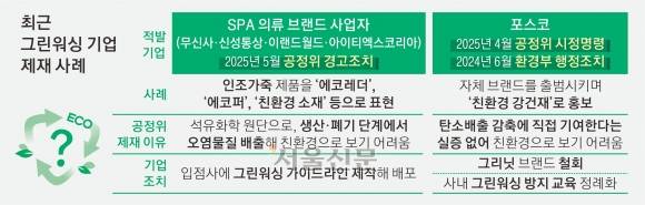 친환경적이지 않은 제품을 친환경인 것처럼 위장해 표시·홍보하는 ‘그린워싱’을 둘러싼 기업과 규제당국 간 긴장도가 높아지고 있다. 이재명 대통령의 대선 공약에 ‘무늬만 녹색인 환경·사회·지배구조(ESG) 워싱에 대한 규율 강화’가 포함되는가 하면, 공정위는 2023년 환경 관련 표시·광고에 관한 심사 지침을 개정한 이후 처음으로 올해 4~5월 그린워싱을 연이어 제재했다.