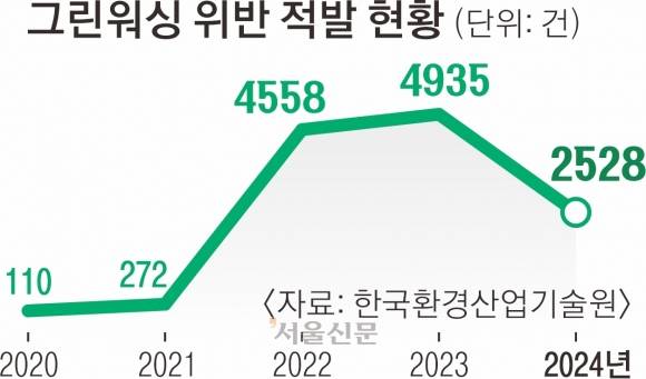 환경부 산하의 한국환경산업기술원이 적발한 그린워싱 건수는 2020년 110건에서 2024년 2528건으로 급증했다. 발등에 불이 떨어진 기업들에선 볼멘소리가 나온다. 그린워싱에 대한 명확한 기준이 없고 관계 기관의 해석에 결론이 좌우되다 보니 사전 대처가 어렵다는 것이다. 섣부르게 친환경 행보를 했다가 기업 이미지만 나빠질 것을 우려해 친환경 행보를 중단하는 게 낫다는 자조도 나온다.