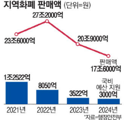 문 정부 집권기인 2021년 1조2522억원의 역대 최대 국비 예산 지원이 이뤄지며 23조6000억원이 판매됐던 지역화폐는 이듬해 27조2000억원이 팔리며 정점을 찍었다.
